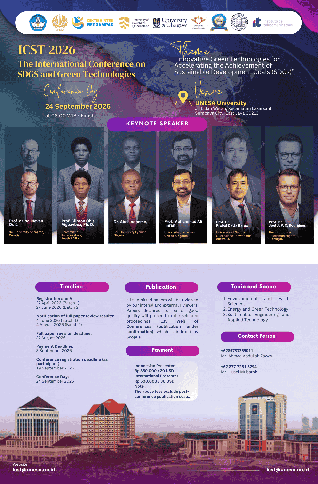Ultimately, ICST 2026 serves as a strategic forum for advancing research, innovation, and collaboration in environment, energy, and earth sciences. Through knowledge exchange and partnership building, this conference aims to support the acceleration of sustainable development efforts and to position higher education and research institutions as key contributors in shaping a more sustainable and resilient future.